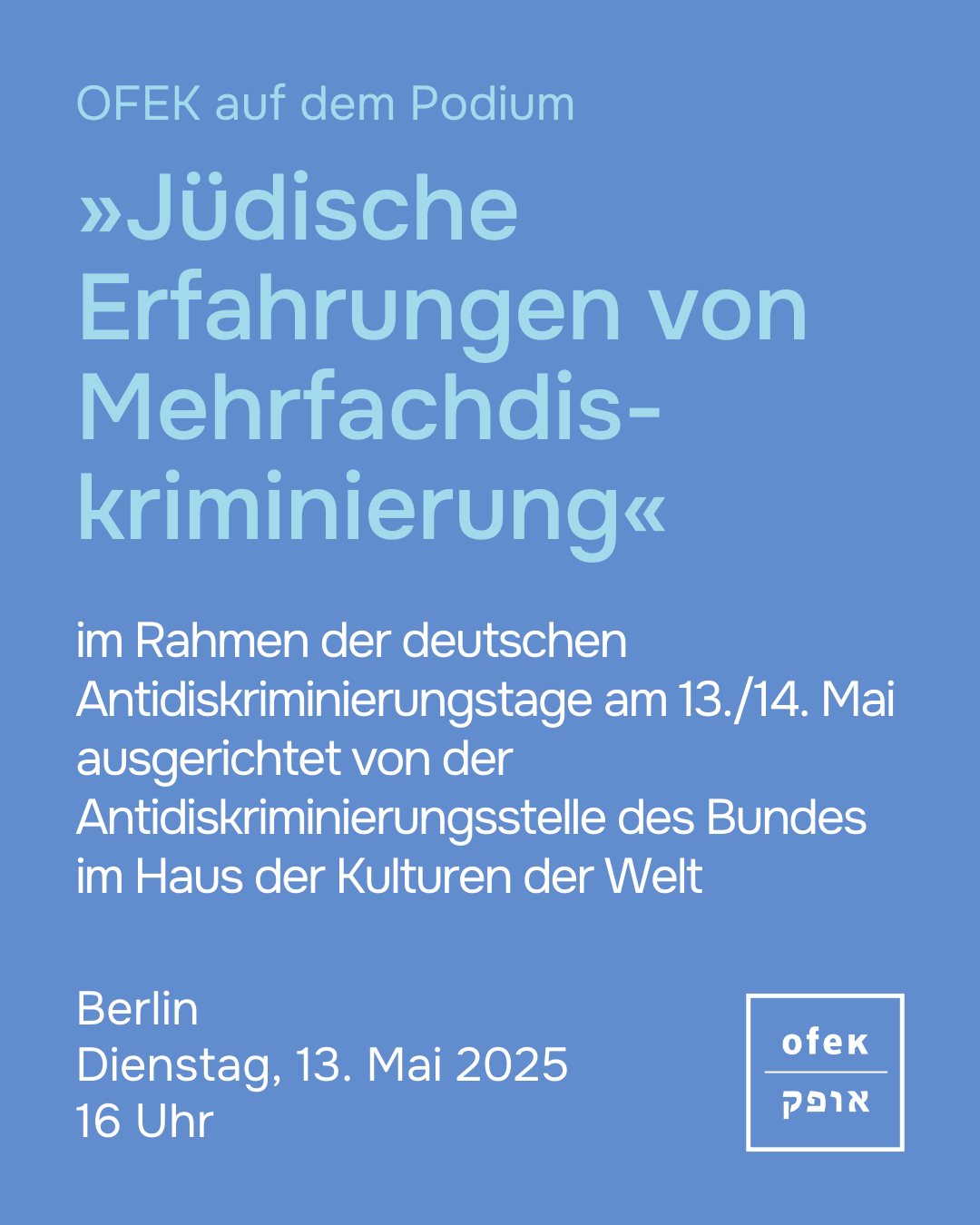 Am 13. Mai 2025 um 16 Uhr wird Marina Chernivsky, Geschäftsführerin von OFEK e.V., gemeinsam mit Shila Erlbaum (Zentralrat der Juden in Deutschland), Grigory Rabinovich (Jüdische Gemeinde Bochum-Herne-Hattingen), Rechtsanwältin Dr. Hannah Rubin und der Moderatorin Dinah Riese über das Thema “Jüdische Erfahrungen von Mehrfachdiskriminierung” sprechen. Das Panel findet im Rahmen der deutschen Antidiskriminierungstage 2025 statt, welche die Antidiskriminierungsstelle des Bundes (ADS) am 13. und 14. Mai 2025 von der im Haus der Kulturen der Welt veranstaltet.