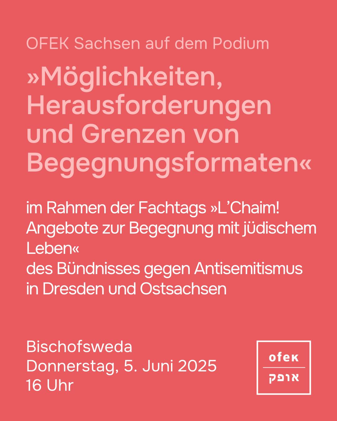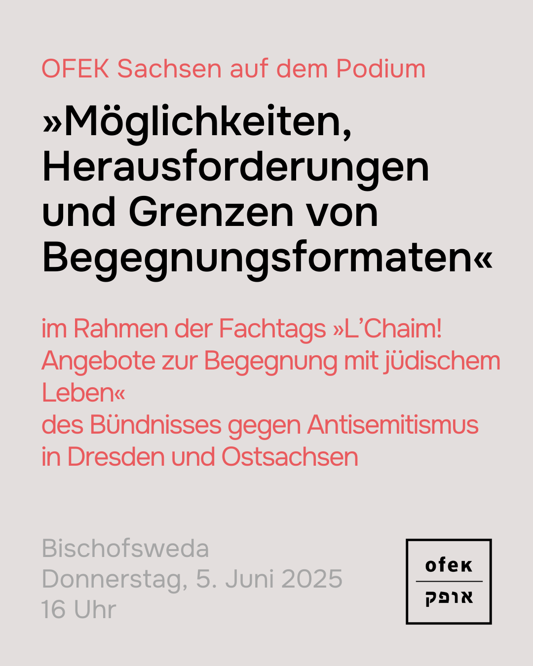 Am 4. Juni ist das Team unseres Beratungsstandorts OFEK Sachsen gemeinsam mit Mitarbeitenden von @meet_a_jew Teil eines moderierten Gesprächs zu den Möglichkeiten, Herausforderungen und Grenzen von Begegnungsformaten. Das Gespräch findet im Rahmen des Fachtags „L’Chaim! Angebote zur Begegnung mit jüdischem Leben“ des Bündnisses gegen Antisemitismus in Dresden und Ostsachsen statt. Der Fachtag richtet sich an interessierte Pädagog:innen.