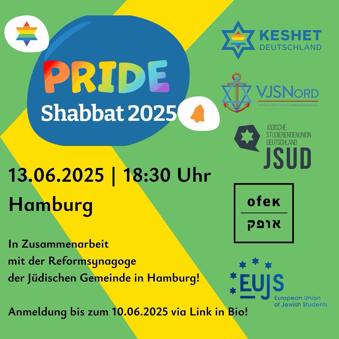 Wir freuen uns sehr, euch zu unserem Pride Shabbat in Zusammenarbeit mit der JSUD, Keshet DE und der Reformsynagoge der Jüdischen Gemeinde in Hamburg einzuladen. Dieser Abend ist eine wunderbare Gelegenheit, gemeinsam die Vielfalt LGBTQIA+ Gemeinschaft zu feiern. ????????️????????????️⚧️????