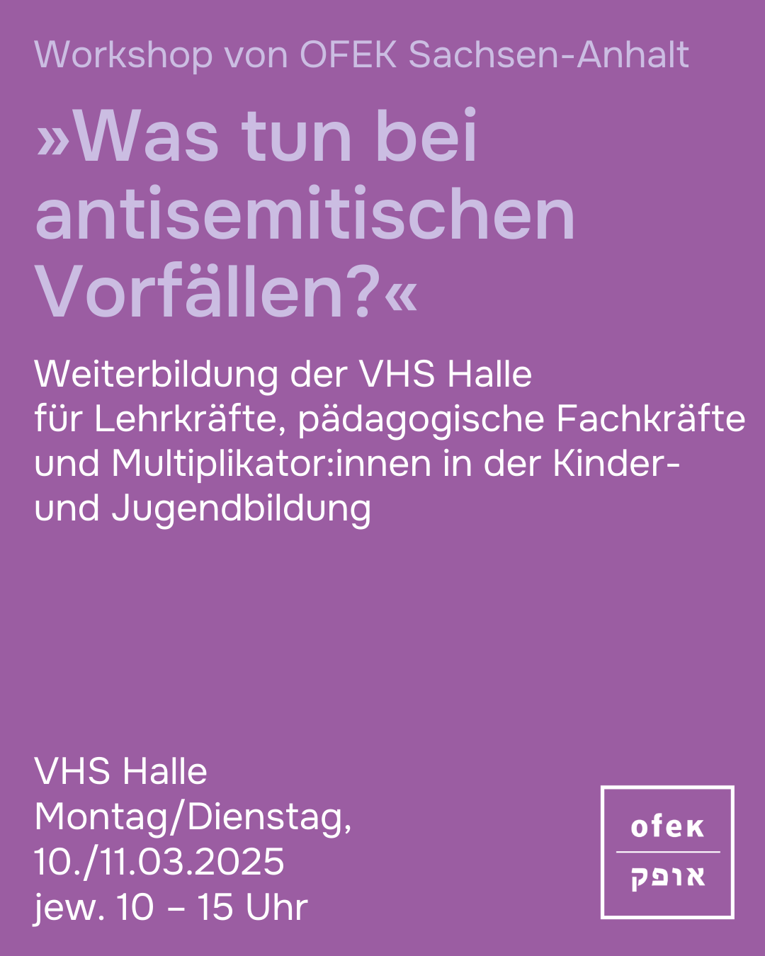 Am Montag und Dienstag, 10. und 11. März 2025, führen zwei Beraterinnen aus dem Team von OFEK Sachsen-Anhalt den Workshop “Was tun bei antisemitischen Vorfällen?” durch. Der jeweils von 10 bis 15 Uhr an der Volkshochschule Halle (Saale) stattfindende Workshop ist eine Fortbildung für Lehrer:innen, pädagogische Fachkräfte und Multiplikator:innen in der Kinder- und Jugendbildung.