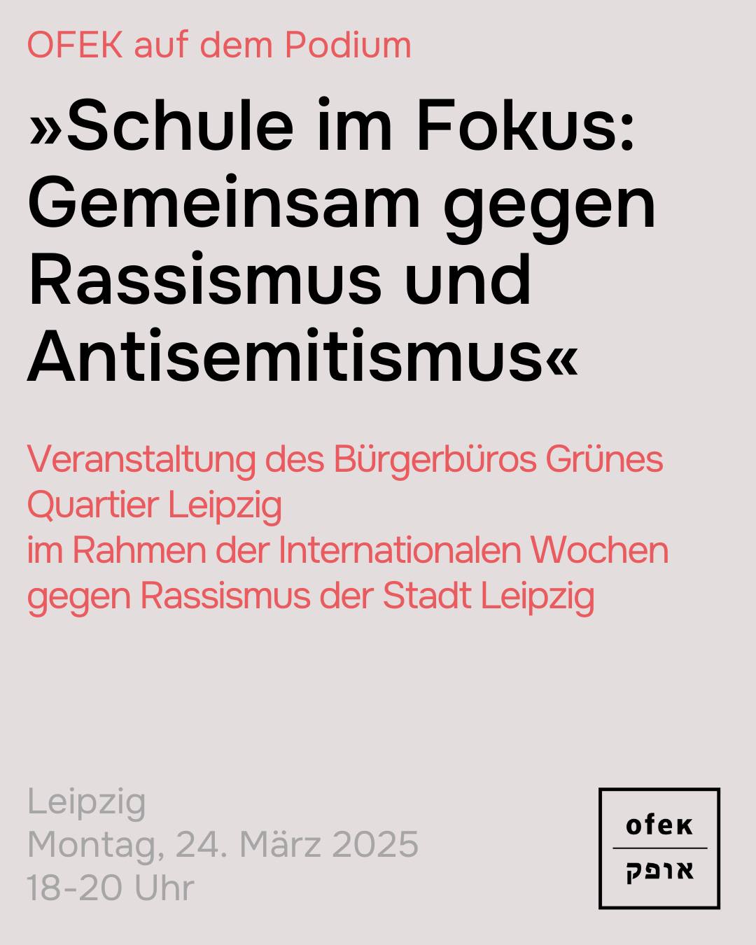 Am 24. März findet um 18:00 Uhr im Abgeordnetenbüro von MdL @chmelcher in Leipzig eine Podiumsdiskussion zum Thema „Schule im Fokus: Gemeinsam gegen Rassismus und Antisemitismus“ statt. Neben Melcher (@gruenefraktionsachsen), Gesine Großert (Vorsitzende des Stadtschülerrat Leipzig), Claudia Maaß (Stellvertretende Vorsitzende gewsachsen Bereich Schule) und Theresa Kühn (@ncd_sachsen) wird auch OFEK e.V.-Geschäftsführerin @marinachernivsky an der Diskussion darüber teilnehmen, wie respektvolle, sichere Räume für Kinder und Jugendliche geschaffen werden können.