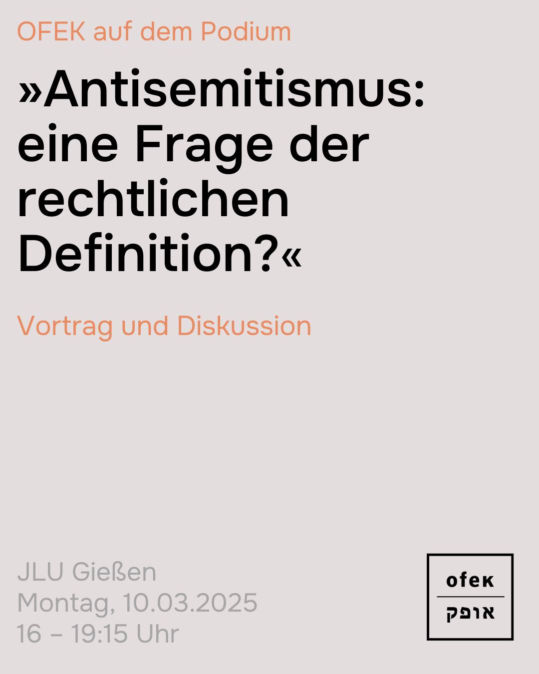 Am kommenden Montag, 10.03.2025, ist OFEK e.V. vor Ort bei der Veranstaltung „Antisemitismus: eine Frage der rechtlichen Definition?“ des Gießener Graduiertenzentrums Sozial-, Wirtschafts- und Rechtswissenschaft und des Forschungsnetzwerks Antisemitismus im 21. Jahrhundert (FoNA21). Die Veranstaltung findet von 16:00 bis 19:15 Uhr an der @jlu.giessen statt. Nach einem Vortrag von Dr. habil. Klaus Holz (Evangelische Akademien in Deutschland e.V.) ist OFEK e.V.-Geschäftsführerin @marinachernivsky ab 17:45 Uhr auf dem Podium bei der Diskussion zum Thema der Veranstaltung. Außer Chernivsky und Holz diskutieren die Antisemitismusbeauftragte der Staatsanwaltschaft Düsseldorf Ricarda Battenstein und Prof. Dr. Lothar Zechlin von der @uni_duisburg_essen. Dr. Nina Keller-Kemmerer (JLU Gießen) moderiert.