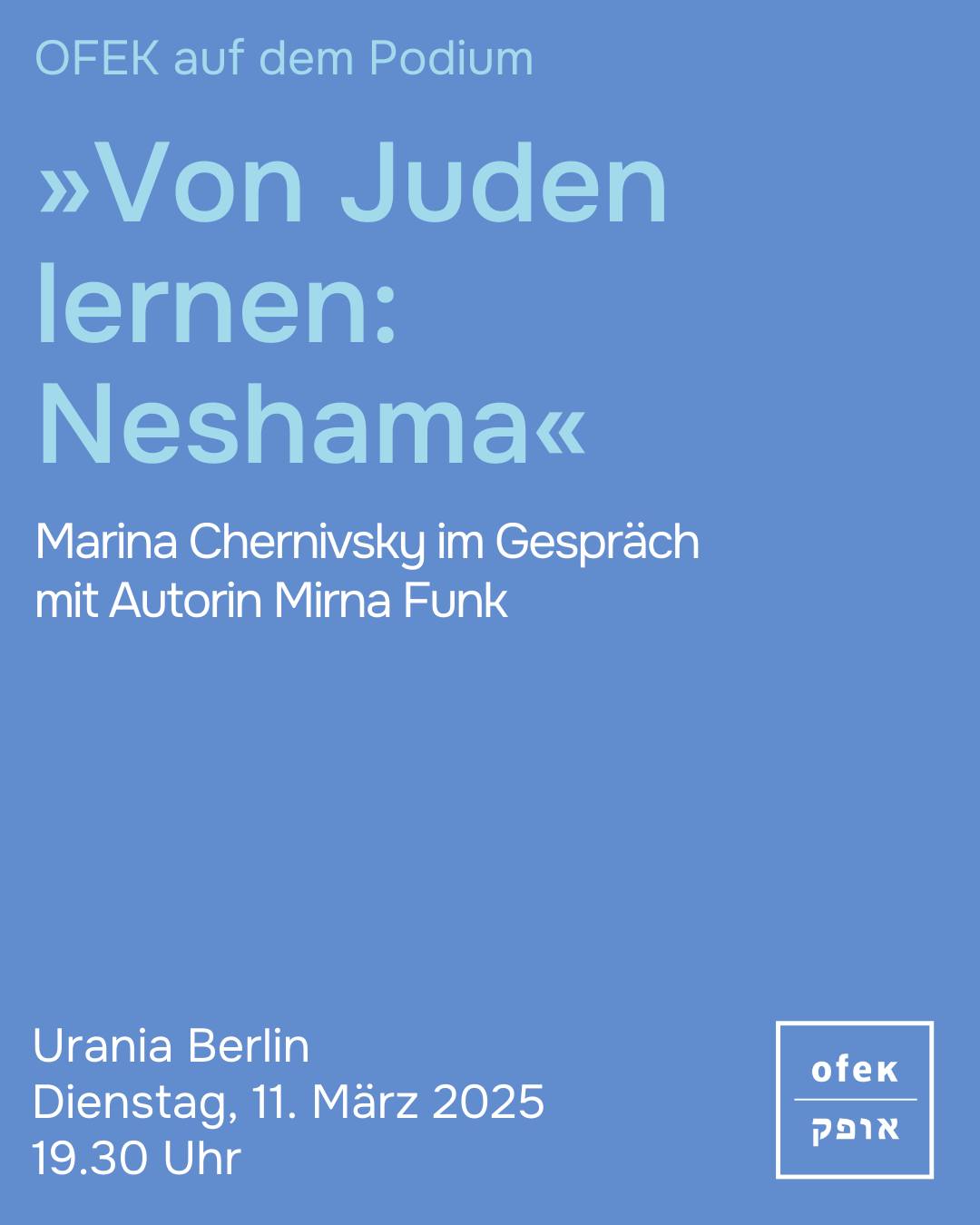 Am Dienstag, 11. März 2025, ist OFEK e.V.-Geschäftsführerin Marina Chernivsky zusammen mit der Autorin Mirna Funk auf dem Podium. Das Gespräch in der Urania Berlin unter dem Titel „Von Juden lernen: Neshama“ beginnt um 19:30 Uhr.