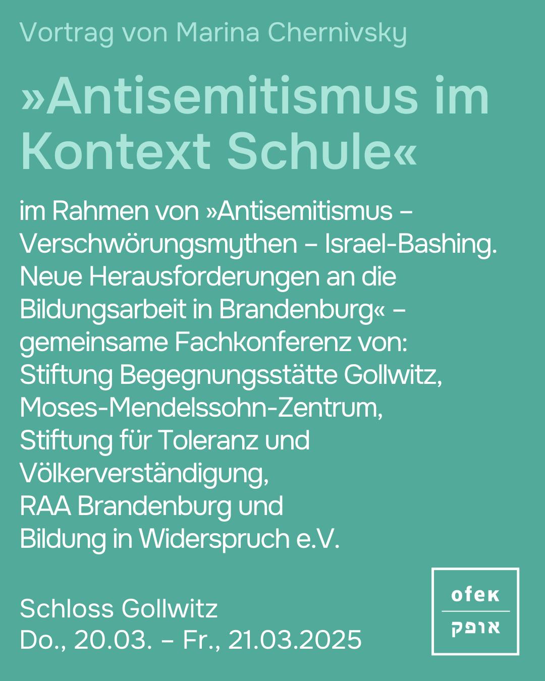 Am 20. März 2025 ist OFEK auf der Fachkonferenz „Antisemitismus – Verschwörungsmythen – Israel-Bashing. Neue Herausforderungen an die Bildungsarbeit in Brandenburg“ in der Begegnungsstätte @schlossgollwitz vor Ort: Um 14:45 hält OFEK e.V.-Geschäftsführerin @marinachernivsky einen Vortrag zum Thema „Antisemitismus im Kontext Schule“.